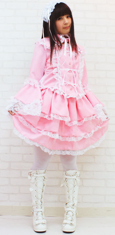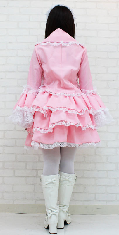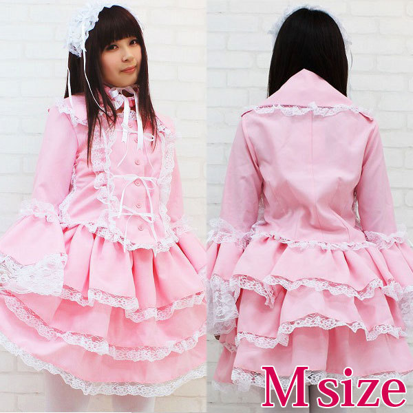 仕様Mサイズ:B〜94cm・W62〜106cm 丈:上着48cm(袖丈62cm・肩幅38cm)・スカート48cm 付け襟(首回り)40cm セット内容:上着(前ボタン)・スカート(ウエスト部分ゴム、スカート3枚仕立て、裏地付き、チュールパニエ付き)・付け衿(ボタンにて着脱可)・ヘッドドレス